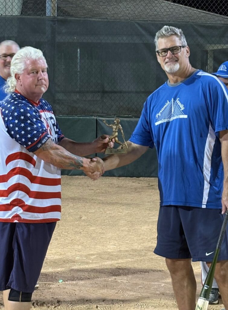 MASTERS CHAMPION! Keith Dunbar accepts the home run trophy from SSS President Scott Nichols, after crushing 17 round-trippers in 18 games