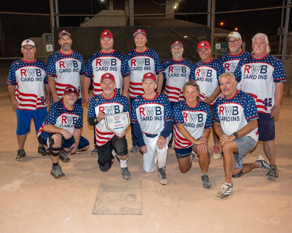 2025 MASTERS TOURNAMENT WINNERS! RWB Card Insurance defeated the Pittsburgh Crawfords 18-15 to win the Masters single-elimination Tournament. Front row, l-r: Larry (Kid Rock) Wilczynski, Terry Moore, Mike Hamann, Christine Meadows, and Gary Parthemer. Back row, l-r: Bob Zubkoff, Dave Turshon, Mike Lapoint, player/sponsor Bob Ruckman, player/manager Jeff Aiello, Randy Robinson, Todd Omey, and Scott (Nick) Nichols.