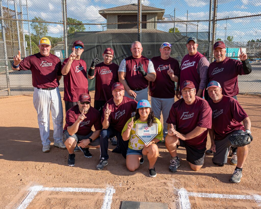 2025 CHAMPIONS! Fricker’s Maroon won the SSS 2025 League Championship and in the tournament finals, defeated Sidelines 23-11 to win the SSS tournament . Front row, L-R: Matt Ciecka, player/manager/SSS board member Joe Beham, Scott Dheel, and Jeff Wagenhauser. Back row, L-R: Jeff Batanian, Michael “MJ” Rochowiak, Jay Kennedy, Chad Collins, Bob Collins, Shaun Dresch, and George Hilfiger. Not pictured: Ed Reed. Fricker’s Maroon capped off an incredible season, going 18-4 in total, and never losing to the same team twice. What an incredible feat, especially given every team in the league is so talented, and you have to come play each and every night. Thanks guys, for being a talented team but even better teammates ! -Joe