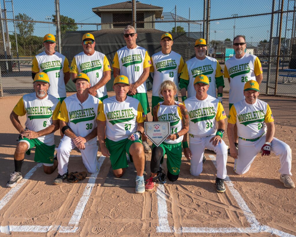 2025 MASTERS LEAGUE CHAMPIONS! Bull Moose Retirement Planning went 14-4 in the regular season to take home the league title. Front row, l-r: Rick Obert, Joe Keenan, Brett Crosby, Kim Crosby, Jim Elchert, and manager Gary Downey. Back row, l-r: Dave Durfey, Bobby Algier, Tom Spy, John Arrington, player/sponsor Mark Clair (Mr. Mooseletic himself), and Dave Obert.